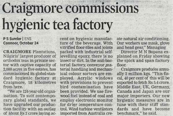 Craigmore Plantations, Nilgiris' largest producer of Odrthodox teas in private sector with captive capacity of 2,000 acres in five estates, has commissioned its global-standard hygienic factory at Craigmore...